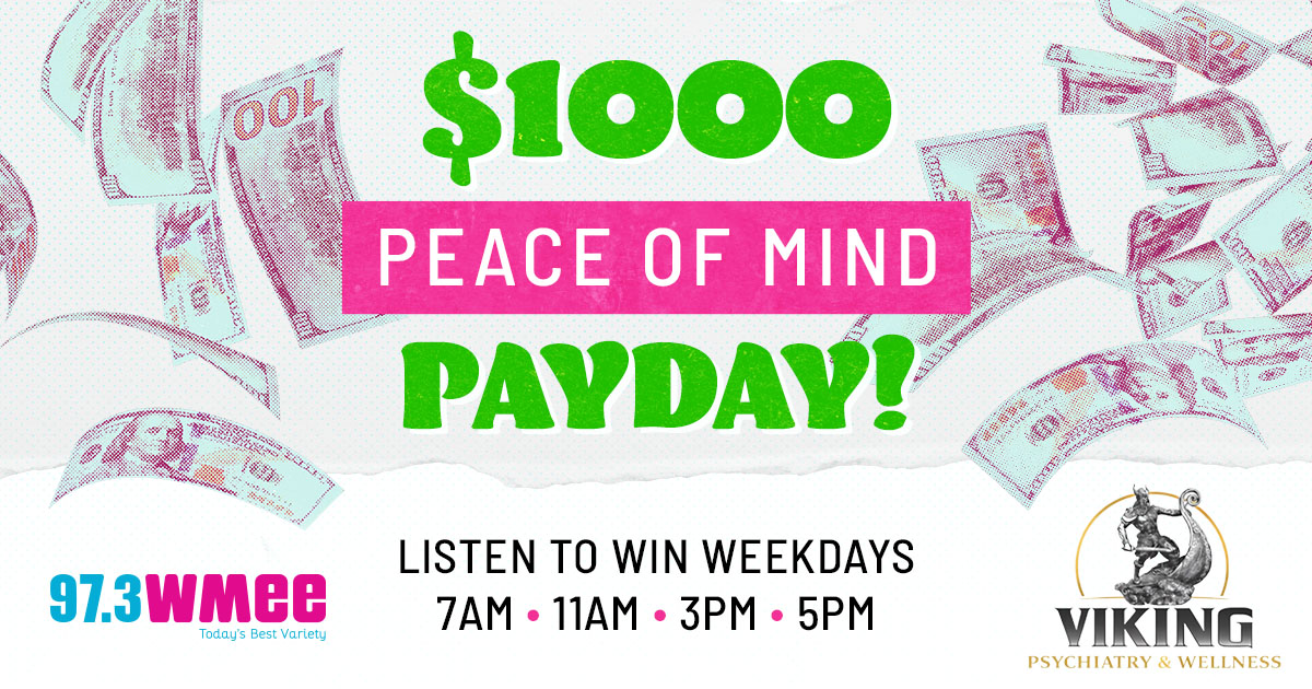 97.3 WMEE and Viking Psychiatry & Wellness have your chance to win $1,000 four times every weekday… with the $1,000 Peace of Mind Payday!